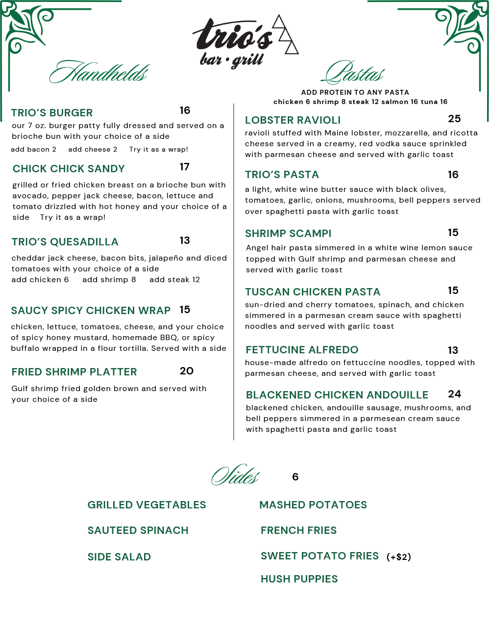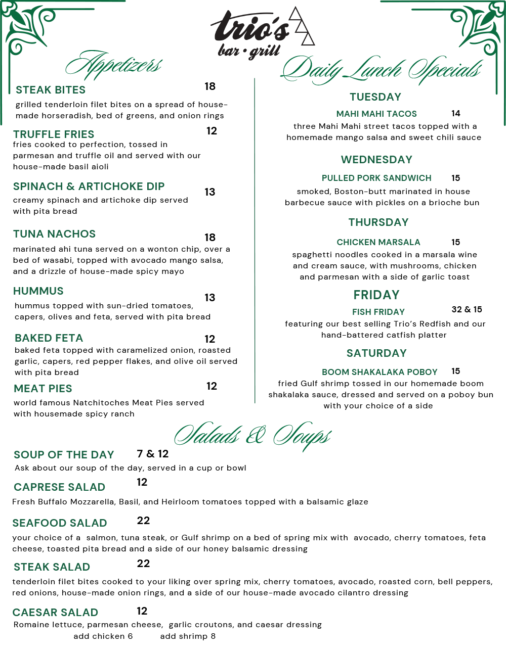 We are located at 94 Versailles Blvd Suite A, Alexandria LA 71303 NOW OPEN FOR LUNCH! Tuesday-Thursday 11AM-9PM Friday-Saturday 11A-10P Sunday – Closed Monday – Closed Follow @TriosDining